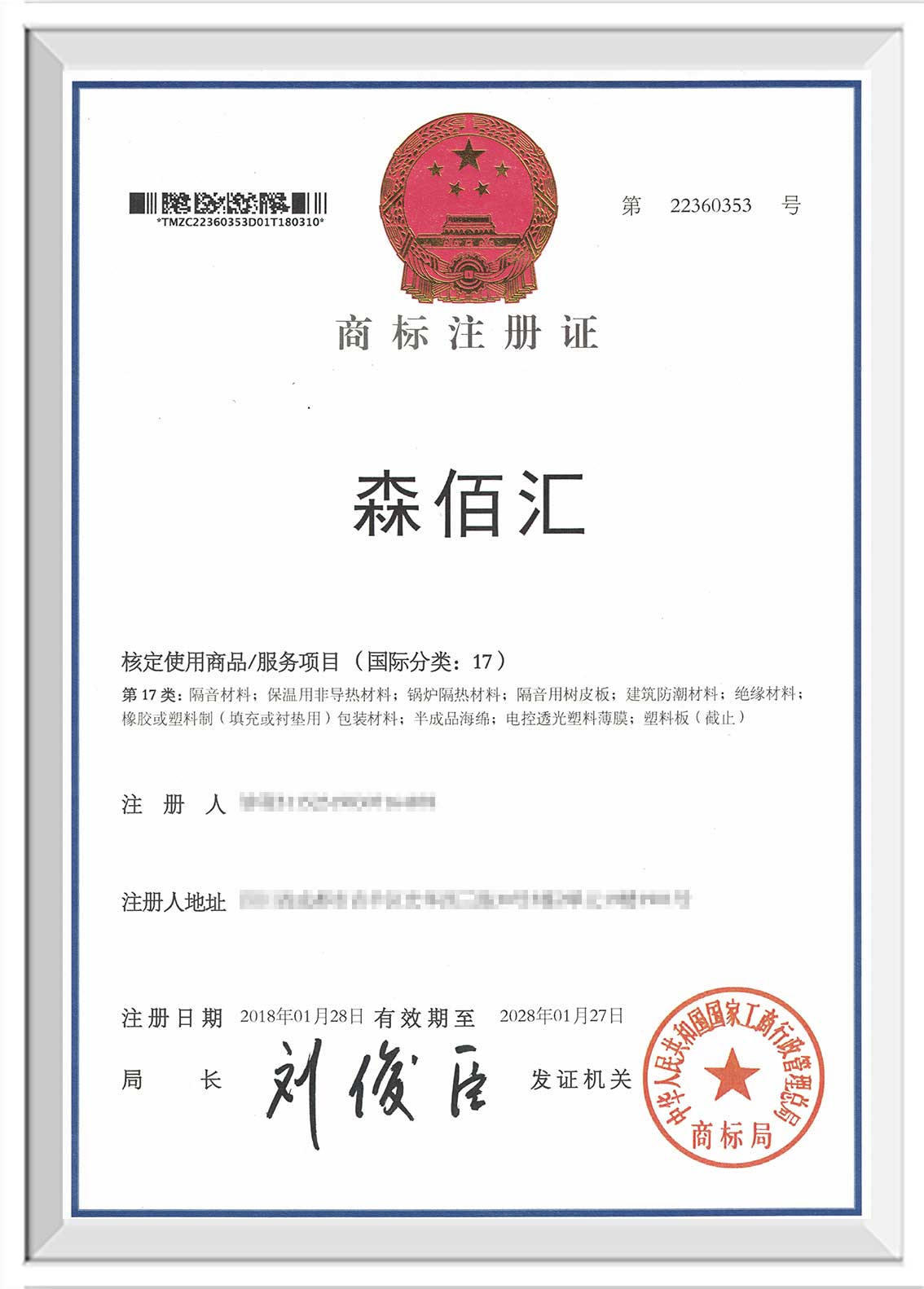 潍坊“森佰汇”商标证书下发至企业